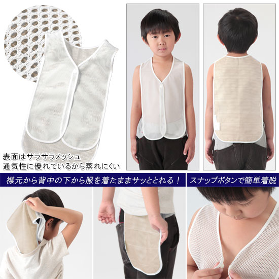 汗でベトつく時期、洋服の中にインナーとして使える! 洗濯可能なのでお洗濯用に2〜3枚まとめ買いが便利! 服を着たまま、襟元から、背中の下から引っ張れば サッと取り出しが可能! スナップボタンで小さなお子様にも着脱が簡単で楽チン♪